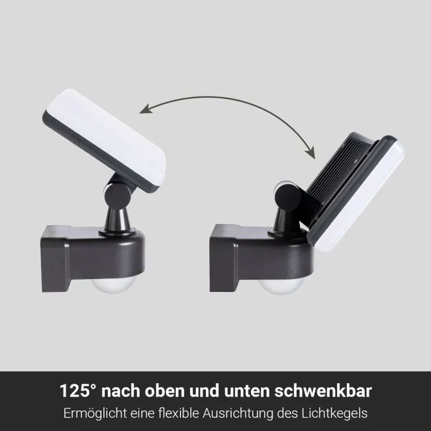 Der Strahlerkopf lässt sich um 125° schwenken, sodass das Licht individuell an die Umgebung angepasst werden kann. Ob großflächige Ausleuchtung oder gezielte Lichtakzente – der LED Außenstrahler Motion passt sich flexibel Ihren Bedürfnissen an.