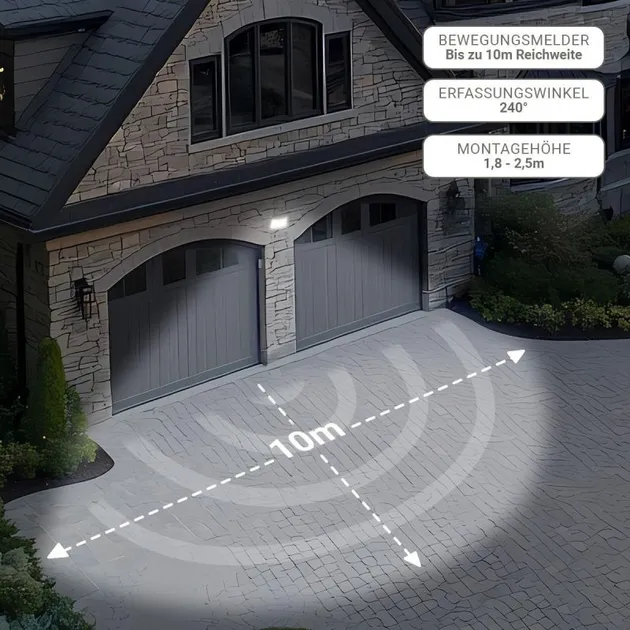 Der Außenstrahler ist mit einem leistungsstarken Bewegungsmelder ausgestattet, der eine Reichweite von bis zu 10 Metern und einen Erfassungswinkel von 240° abdeckt. Damit reagiert er zuverlässig auf Bewegungen in einem großen Bereich und schaltet das Licht nur dann ein, wenn es gebraucht wird – für mehr Sicherheit und eine effiziente Energienutzung.